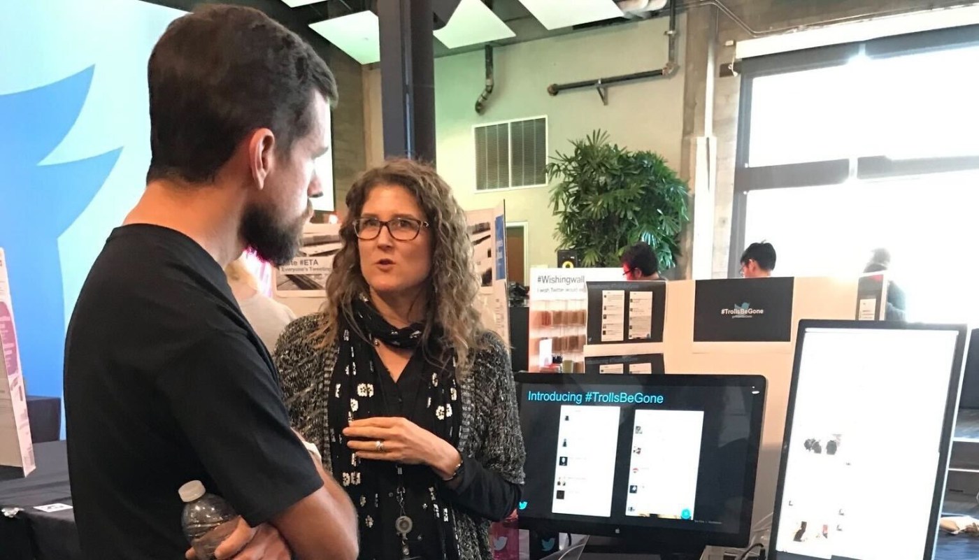 Photo: Kathleen Vignos presenting to Jack Dorsey, Twitter Hackweek 2016