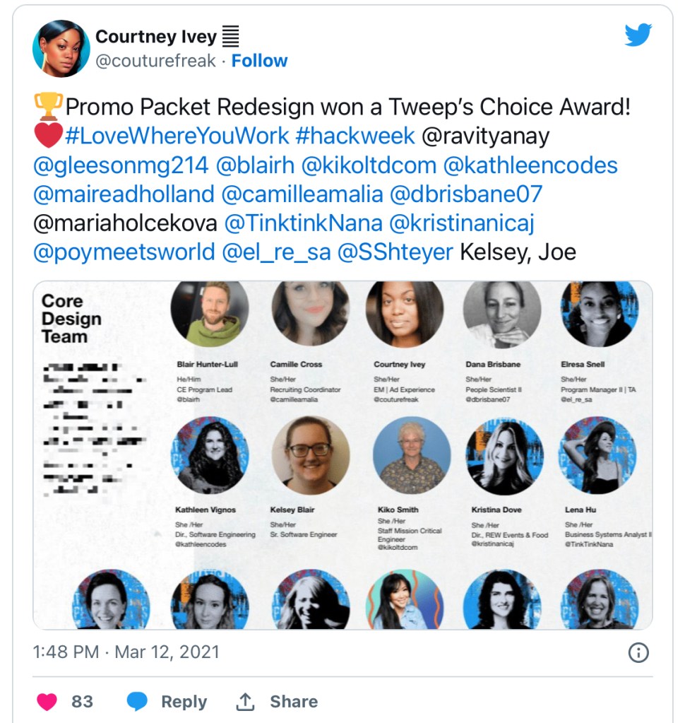 The company-wide hack week was called “Simplify to Scale.” Our team’s focus: Promo Packet Redesign. Through many iterations, our promotion packet templates had helped remove bias and enable objective review across engineering leaders, but they were lengthy and hard to construct. We designed a promotion packet tool that builds artifacts over time to contribute to a promotion story, including mechanisms for anonymous committee review and voting. Our team included engineers, HR, learning and development, real estate and workplace, diversity and inclusion, technical program management, business analysts, and more. We were one of three “Tweep’s Choice Winners” out of dozens of teams. The company plans to build the tool.